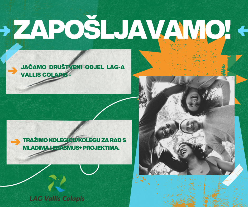 LAG Vallis Colapis raspisuje natječaj za rad u Društvenom odjelu. Osoba će raditi u malom timu koji se bavi radom s mladima, s posebnim naglaskom na Erasmus+ projekte, ali i projekte drugih donatora (nacionalna ministarstva, CERV i slično). Posao uključuje i različite aktivnosti vezane za rad udruga, komunikaciju, koordinaciju i podršku provedbi projekata.