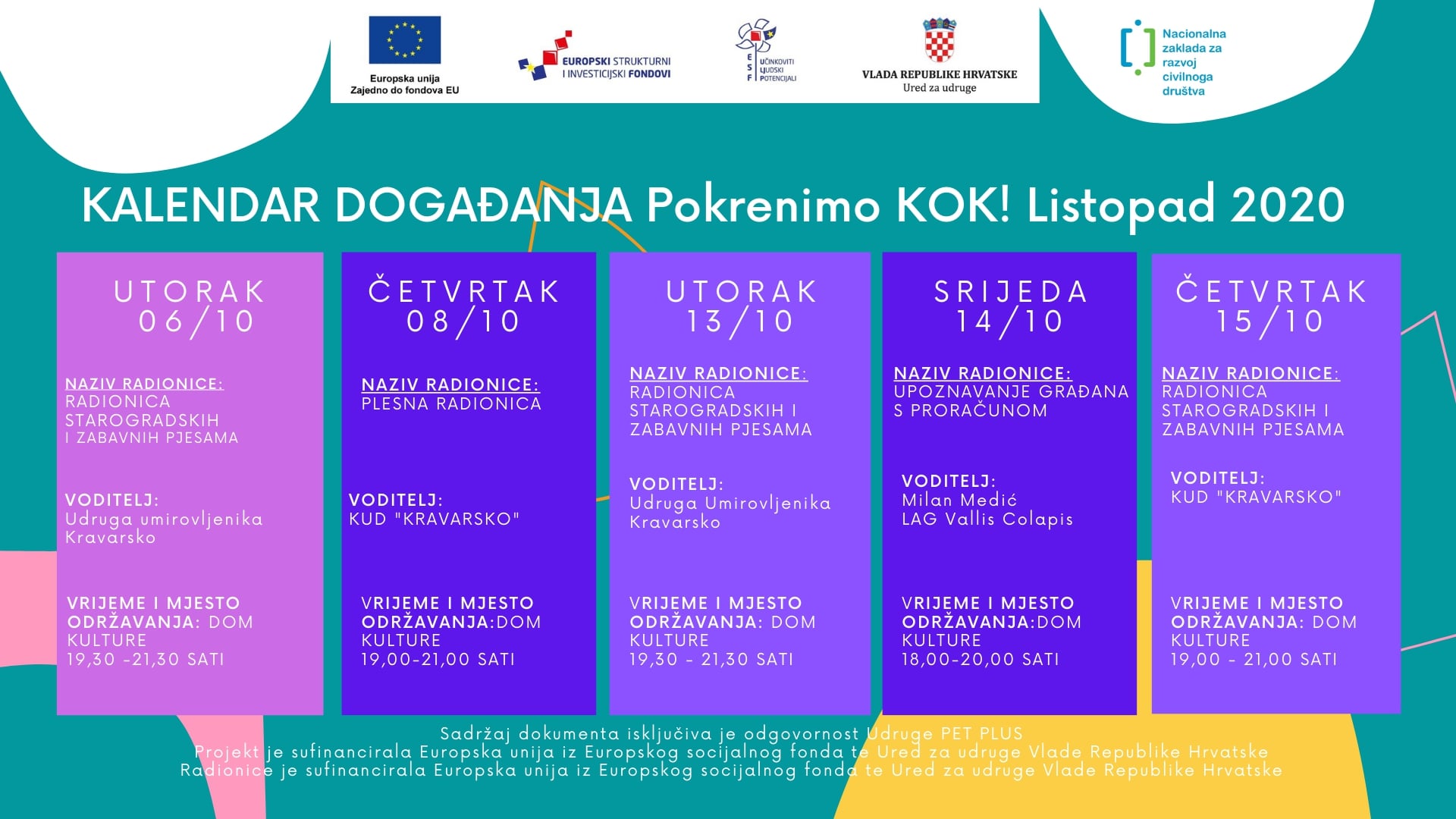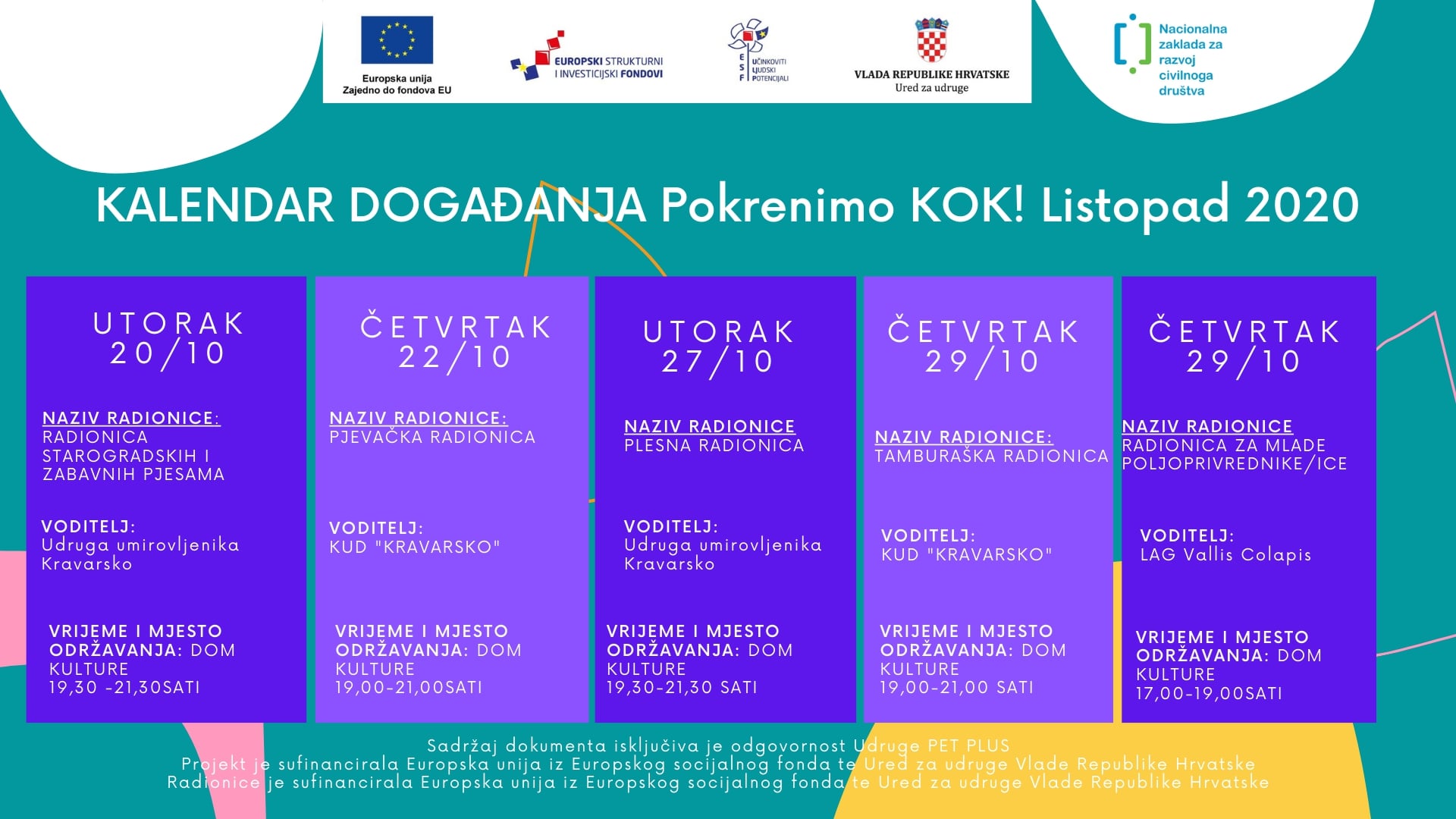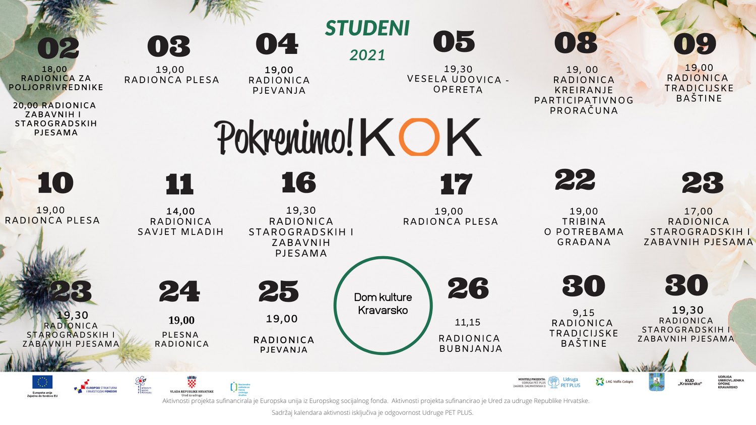 U sklopu projekta Pokrenimo KOK! (koji se financira potporom Europskog socijalnog fonda) u općini Kravarsko su u rujnu 2020. započele prve aktivnosti za građane. Nakon uređenja i opremanja lokalnog Doma kulture, koje je provedeno u kolovozu i prvoj polovici rujna, partnerske organizacije su koncem rujna započele s prvim sadržajima za građane.