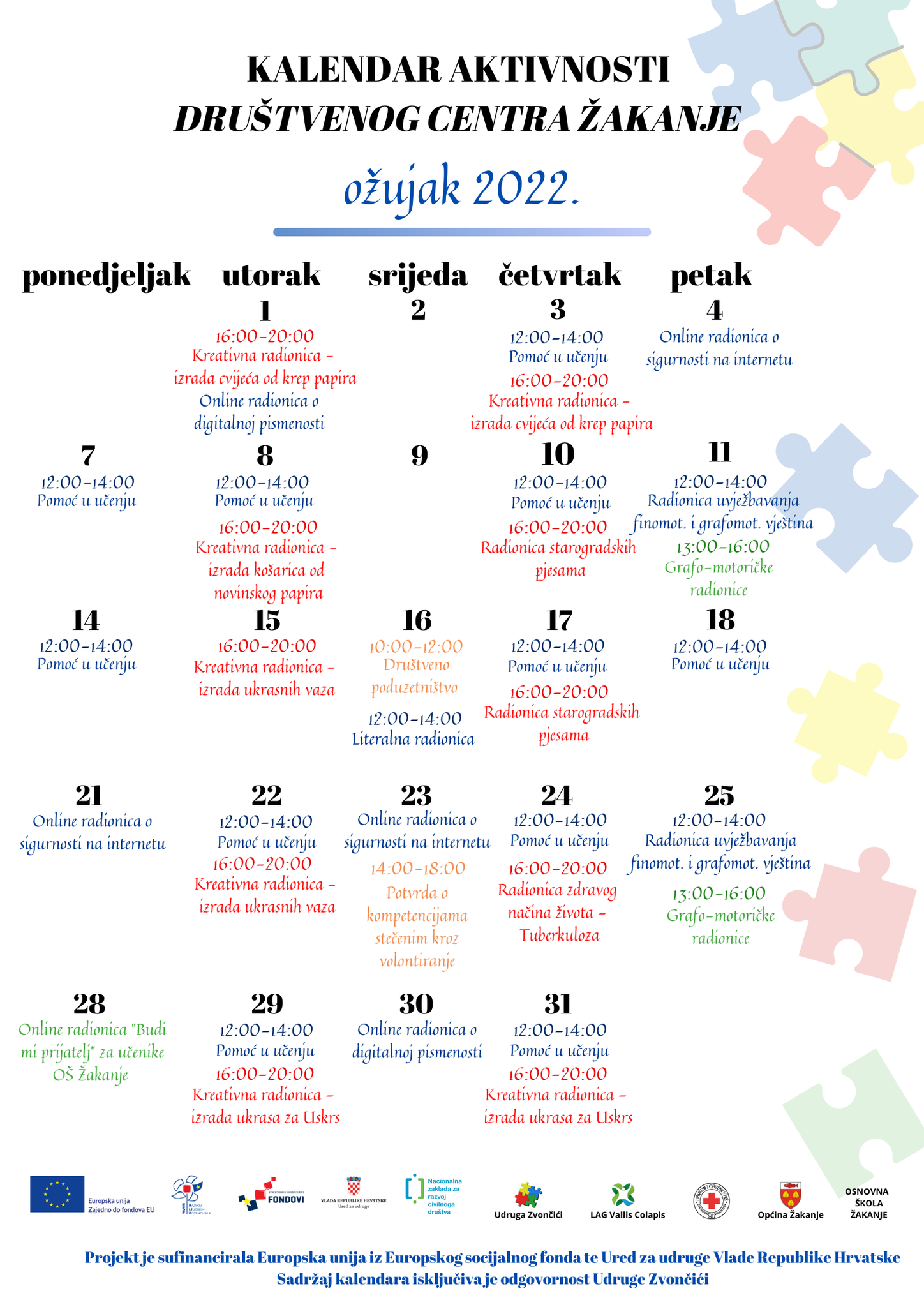 "Partnerstvo za društveni centar u Žakanju" je projekt sufinanciran od strane Europske unije iz Europskog socijalnog fonda (85%) te Ureda za udruge Vlade Republike Hrvatske (15%) u iznosu od 1.999.700,50 kn. Nositelj projekta je Udruga za djecu s teškoćama u razvoju Zvončići, a partneri su LAG Vallis Colapis, Općina Žakanje, Osnovna škola Žakanje te Hrvatski crveni križ Gradsko društvo Crvenoga križa Ozalj. Projekt se provodi od 3. studenog 2020. do 3. listopada 2022. godine.
