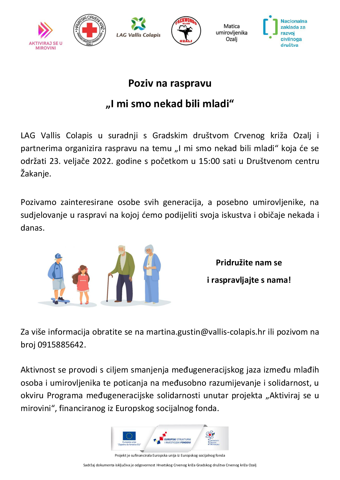 LAG Vallis Colapis u suradnji s Gradskim društvom Crvenog križa Ozalj i partnerima organizira raspravu na temu „I mi smo nekad bili mladi“ koja će se održati 23. veljače 2022. godine s početkom u 15:00 sati u Društvenom centru Žakanje.