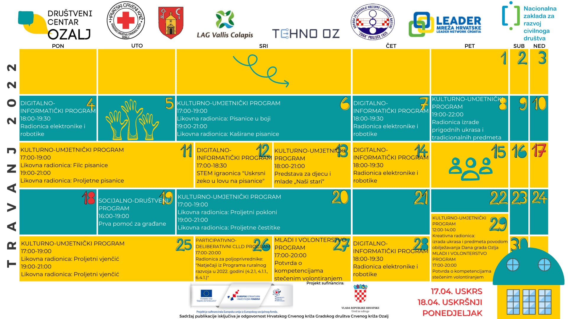 Objavljen je kalendar radionica i aktivnosti za travanj u sklopu projekta "Društveni centar Ozalj". "Društveni centar Ozalj" je projekt sufinanciran od strane Europske unije iz Europskog socijalnog fonda te Ureda za udruge Vlade Republike Hrvatske. Nositelj projekta je Gradsko društvo Crvenog križa Ozalj. LAG Vallis Colapis u travnju provodi dvodnevnu edukaciju o potvrdi o kompetencijama stečenim volontiranjem iz programa Volonterstvo i mladi. Prvi dio edukacije održat će se 27. travnja 2022., a drugi dio održat će se 29. travnja 2022. Za sve detalje pratite Facebook stranicu projekta.