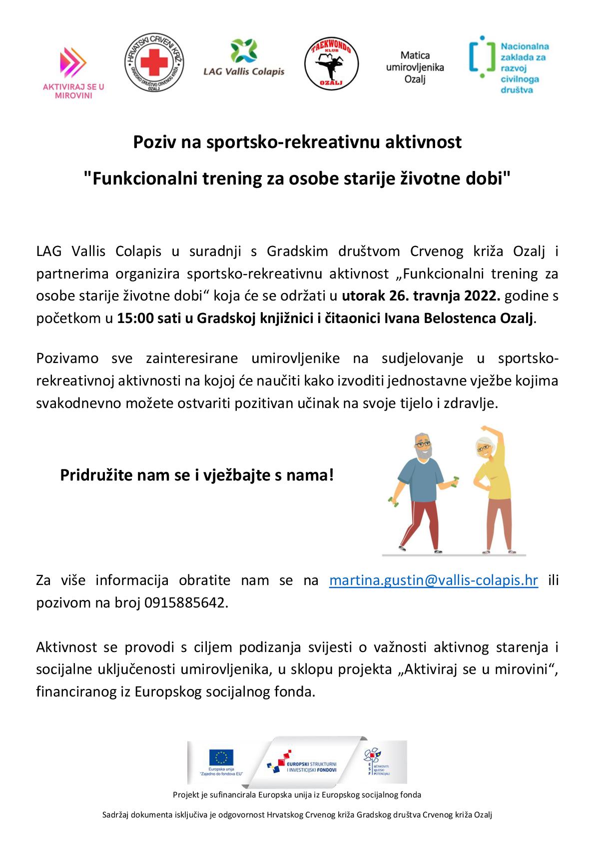 LAG Vallis Colapis u suradnji s Gradskim društvom Crvenog križa Ozalj i partnerima organizira sportsko-rekreativnu aktivnost „Funkcionalni trening za osobe starije životne dobi“ koja će se održati u utorak 26. travnja 2022. godine s početkom u 15:00 sati u Gradskoj knjižnici i čitaonici Ivana Belostenca Ozalj.