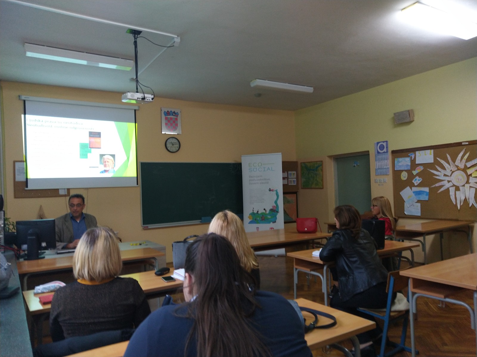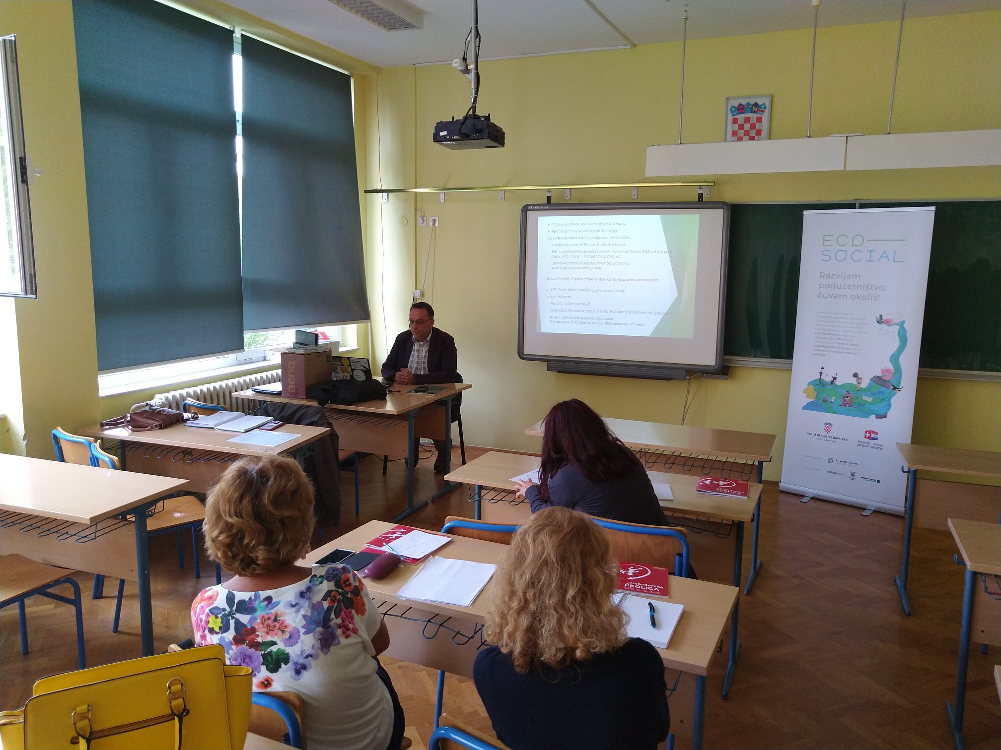 U sklopu projekta „ECO-SOCIAL: Razvijam poduzetništvo, čuvam okoliš!“ održan je prvi set edukacija za učitelje. Edukacija „Temeljne postavke održivog razvoja u međunarodnim dokumentima i deklaracijama“ provedena je za učitelje 6 osnovnih i srednjih škola s područja Karlovačke županije. Riječ je o prvoj od 3 edukacije koje će biti provedene za učitelje u sklopu aktivnosti projekta. Sljedeće dvije edukacije „Uloga volonterstva i zadružne ekonomije u održivom razvoju lokalne zajedniceˇ te „Osnovni elementi oporabe tekstila u RH“ održat će se sljedeće školsko polugodište.