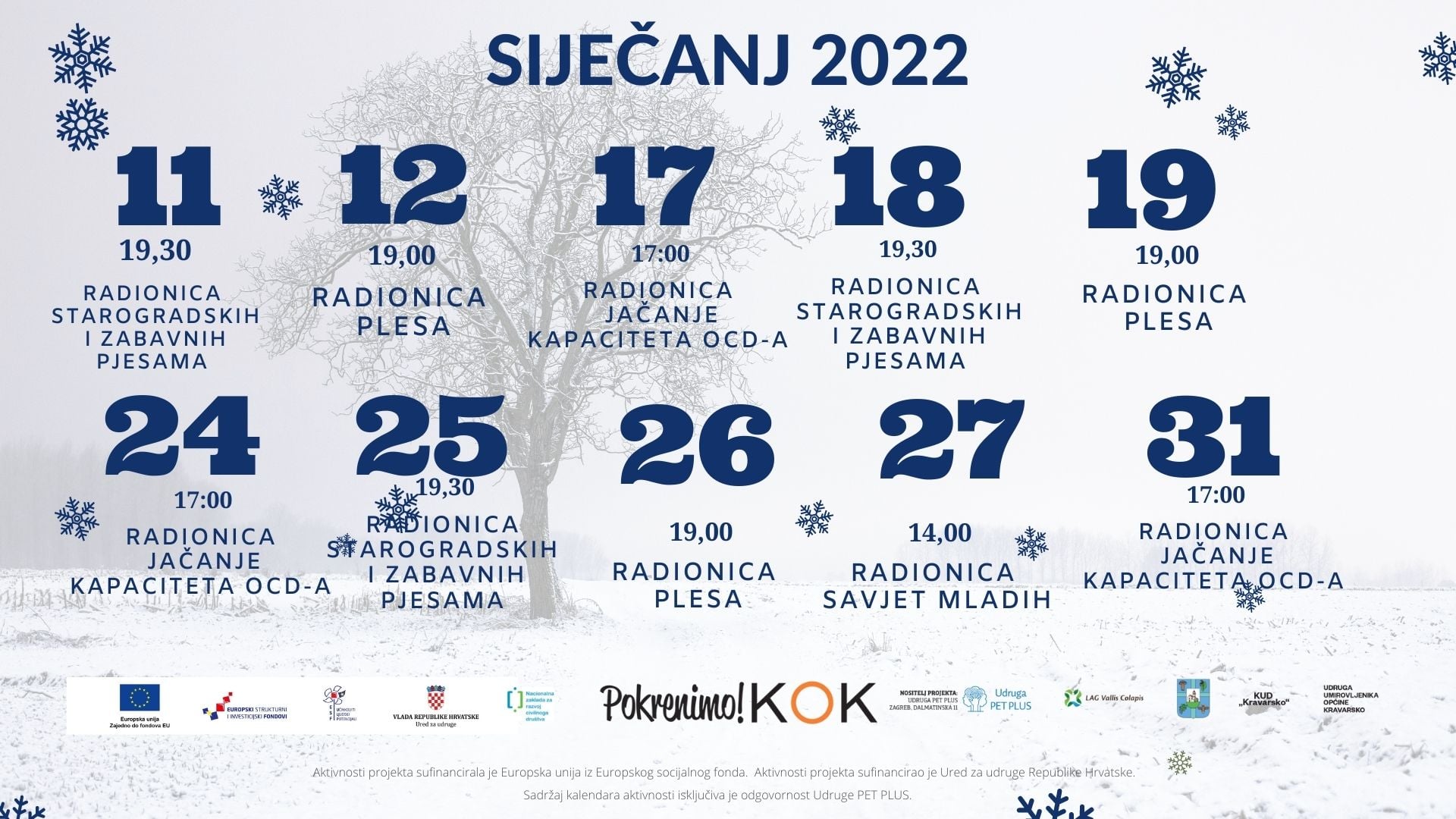 Objavljen je kalendar radionica i aktivnosti za siječanj u sklopu projekta "Društveni centar Ozalj". "Društveni centar Ozalj" je projekt sufinanciran od strane Europske unije iz Europskog socijalnog fonda te Ureda za udruge Vlade Republike Hrvatske. Nositelj projekta je Gradsko društvo Crvenog križa Ozalj. LAG Vallis Colapis u siječnju provodi radionice iz programa Volonterstvo i mladi i Participativno-deliberativnog programa. Prva radionica održat će se 21. siječnja 2022., a tema radionice su Aktivnosti sudjelovanja mladih iz Erasmus+ programa kroz primjer dobre prakse, a druga je radionica jačanja kapaciteta OCD-a "Od ideje do projekta: Erasmus+2". Za sve detalje pratite Facebook stranicu projekta
